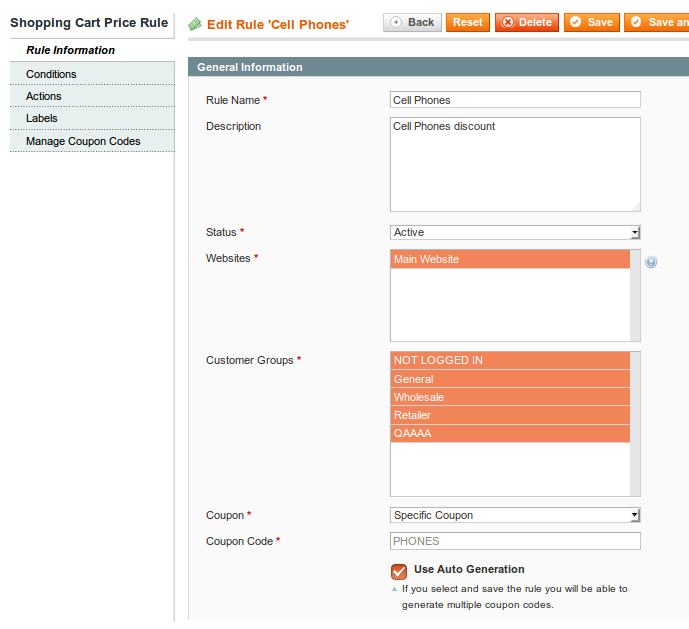 Select Websites and Customer Groups for which this rule will be applied.