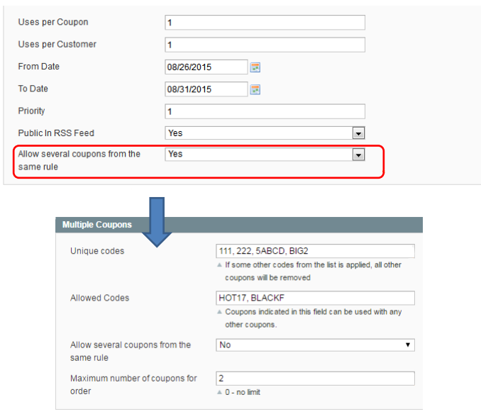 Allow several coupons from the same rule - this setting means that you can allow applying more than one coupon code.