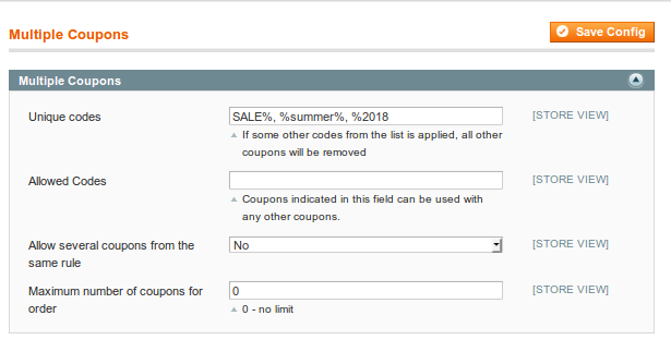 Allowed codes - Indicate coupons that can be applied together with other coupons. In this field, you can also use the symbol '%' to list coupons with the same suffix or prefix.