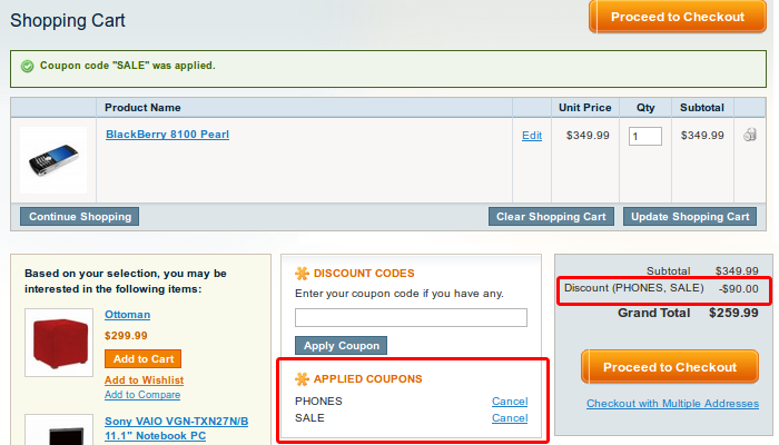 Your customers will be able to enter multiple coupon codes right after you install the extension. All applied coupon codes are also listed in the totals block.