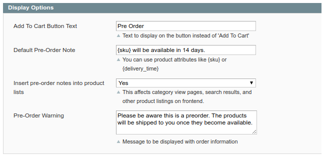 Default Pre-Order Note - Specify this note if you want to display one and the same text with all pre order products. In the note, you can use product attributes as variables: {attribute}.