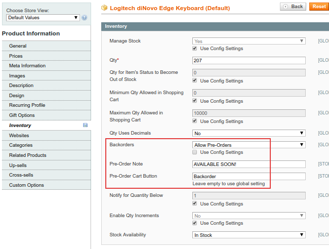 Backorder - To enable pre order feature for a simple product, click on the Inventory tab on the product information page, untick the Use Config Settings checkbox and choose the Allow Pre-Orders option.