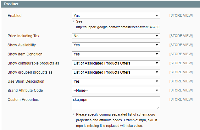 Custom Properties - With this option, admin is able to specify comma-separated list of schema.org properties and attribute codes like mpn, sku.