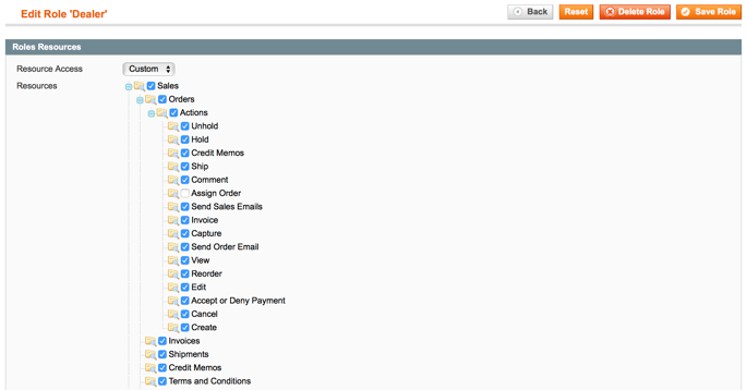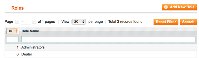 First of all you need to create a user role for sales representatives and dealers. Navigate to Admin panel → System → Permissions → Roles and press the Add New Role button.