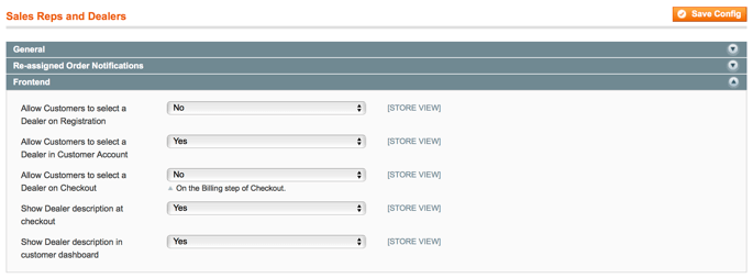At the System → Configuration → Sales Reps and Dealers → Frontend section you can modify the frontend behavior of the extension. Enable or disable the following options to add or remove the appropriate functionality: