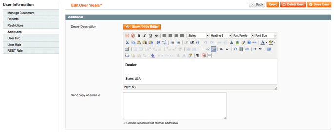 At the Additional tab you can specify additional info about the dealer/sales rep. The info will be displayed to assigned customers on the checkout page as well as on the customer account page.