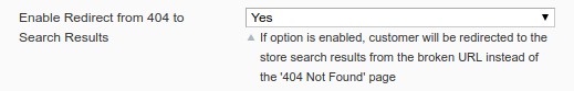 Enable Redirect from 404 to Search Results - Enable feature to redirect customers from 404 Not found pages to the search results pages.