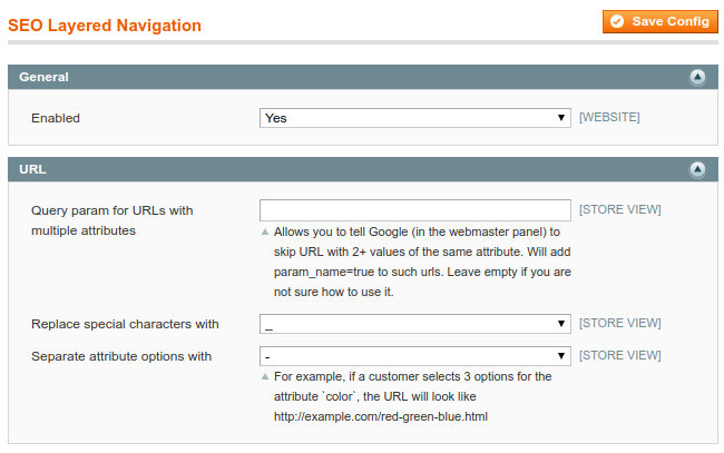 Replace special characters with,Separate attribute options with - Specify ‘-’ or ‘_’ to replace special characters for filter results page URLs.