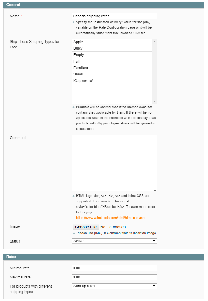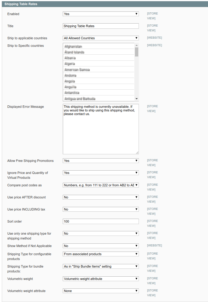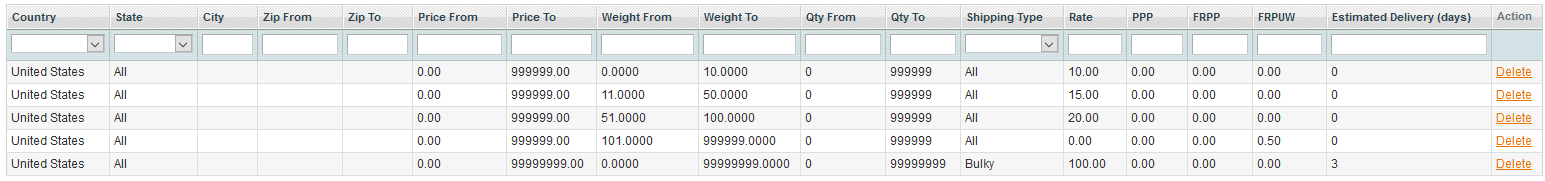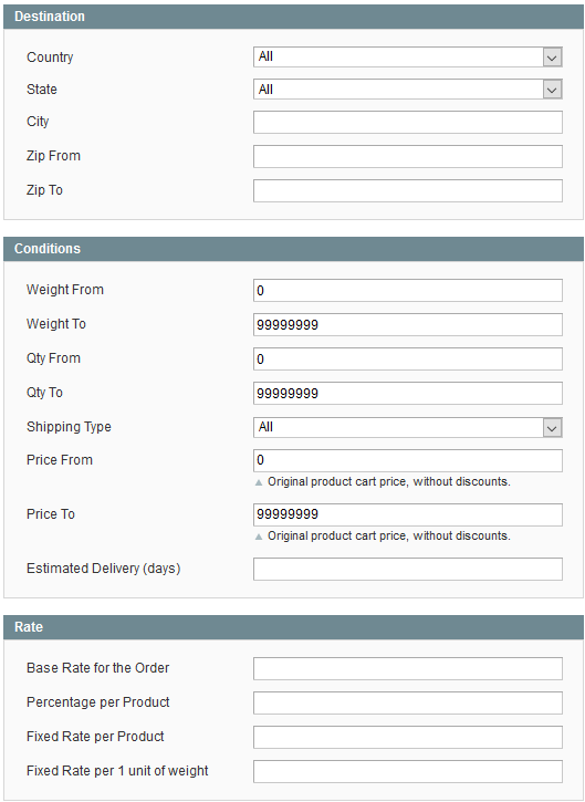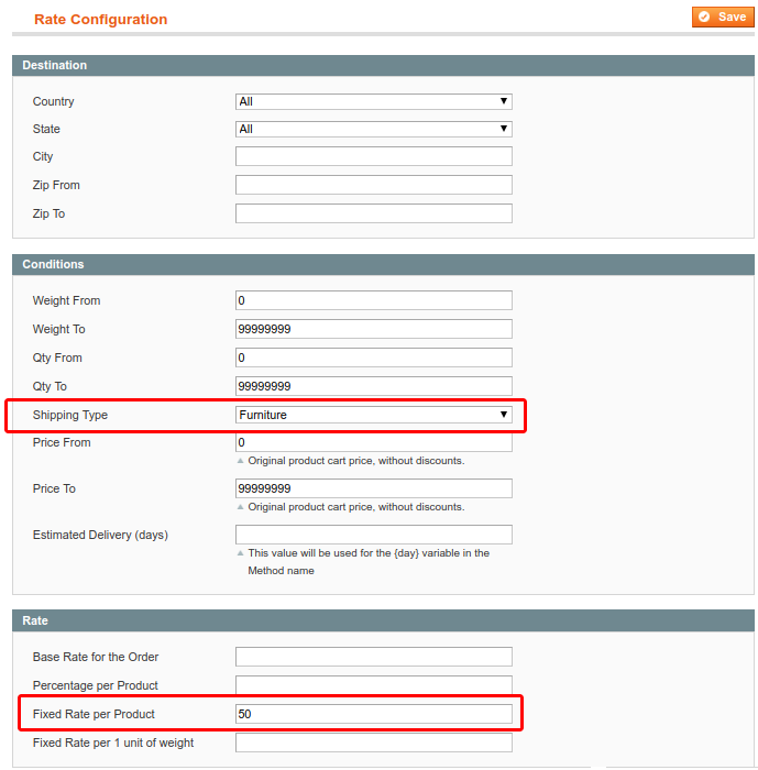 And finally, you need to add a new rate for ‘furniture’ products to the shipping method. Go to Sales > Shipping Table Rates > choose the method > Methods and Rates > select a method or create a new one
