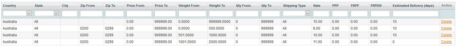 Let's say we've set up rates in our shipping method like this (click on the screenshot to see the example).