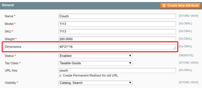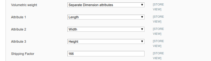 In this method, the volumetric weight is calculated based on the item's dimensions. To use this option, you need to create one dimension attribute and specify this parameter for each item in the following way: height*length*width. And also you need to specify the shipping factor.