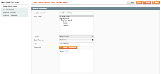 Store View — define the store views for which you want to display this store location.