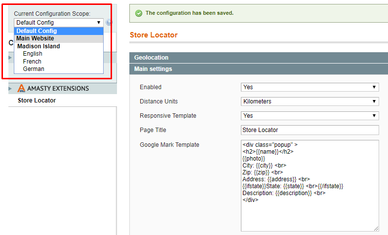 To configure general extension settings please go to System → Configuration → Amasty Extensions → Store Locator and expand the Main Settings section.