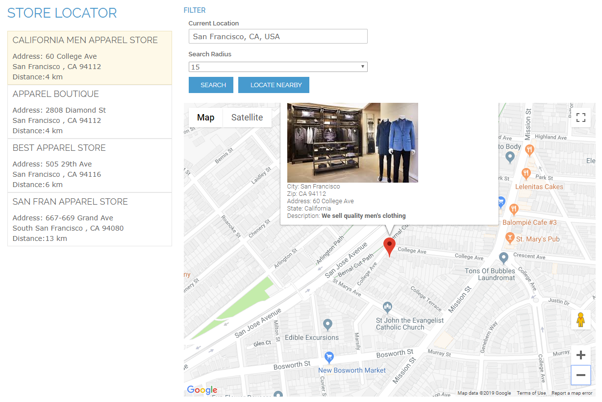 Store locations are added to the locations list and displayed on the map. Customers can specify the exact location to search the nearby stores and see the distance to them by clicking the Locate Nearby button. Also, it’s possible to specify exact radius if needed. You can enable customers to select search radius measurement (see this section for details).