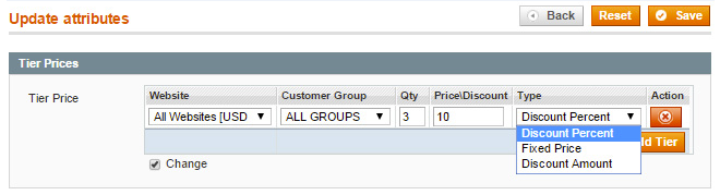 Choose customer group, quality of the product, discount type and amount when setting tier prices for the product.