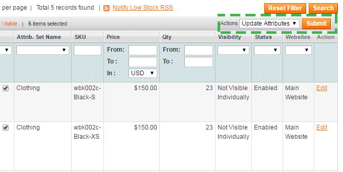 Update selected products in bulk using Update Attributes action on the product grid. Go Catalog → Manage Products. To update several products in a bulk, select the items, choose Update Attributes action and then press Submit button.