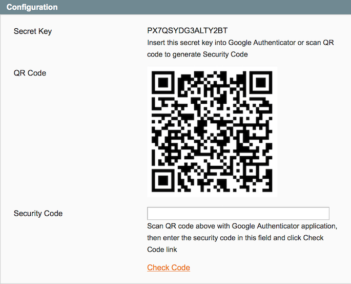 When done, open your Google Authenticator application and register the login by scanning the QR Code or entering the Secret Key. Once your Google Authenticator application is properly configured it will show a one- time passcode that changes every 30 seconds. Fill it in the Security Code field, and click the Check Code link.