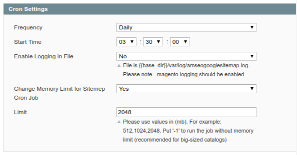 Limit - Specify the standard amount of memory (i.e. 512,1024,2048) in mb to limit the cron job. In case of big-sized catalogs, we would recommend to run the cron job without limit (input -1 in the field).
