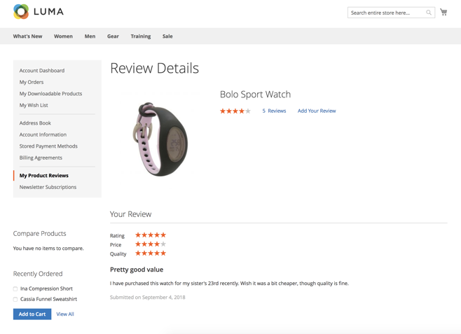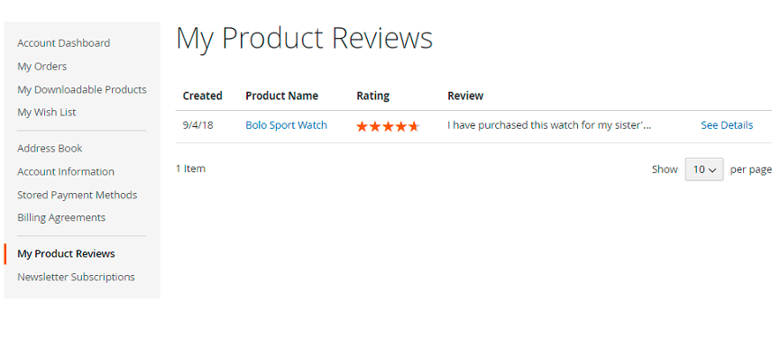 Customers can see all the reviews with accompanying data in their accounts on the My Product Reviews tab.