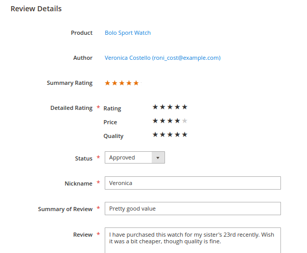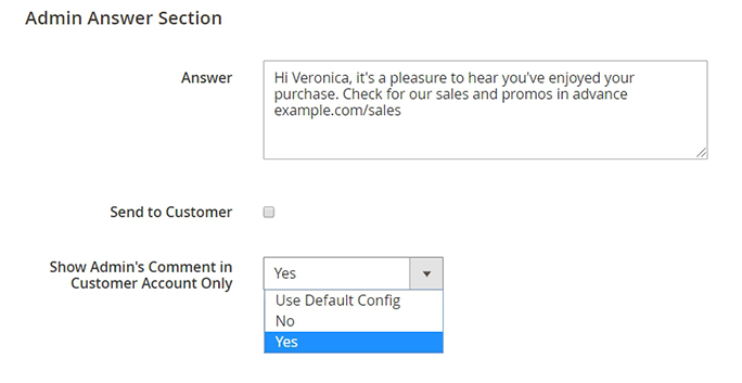 Admin Answer Section - Respond to customers' reviews right from this form. A comment is editable. A comment will be displayed right under the customer's review.