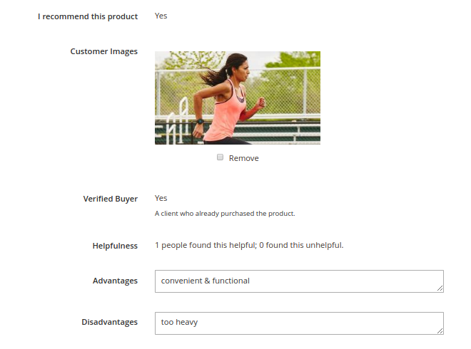Enable Pros and Cons - Set to Yes to add to the customer reviews form separate Advantages and Disadvantages fields. On the frontend - on the reviews page - the pros and cons are displayed as green plus and red minus.