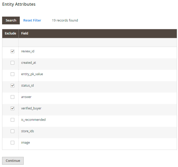 You may also exclude particular attribute values from the exporting if needed. In the Entity Attributes table tick the attribute columns you want to exclude and hit the Continue button.