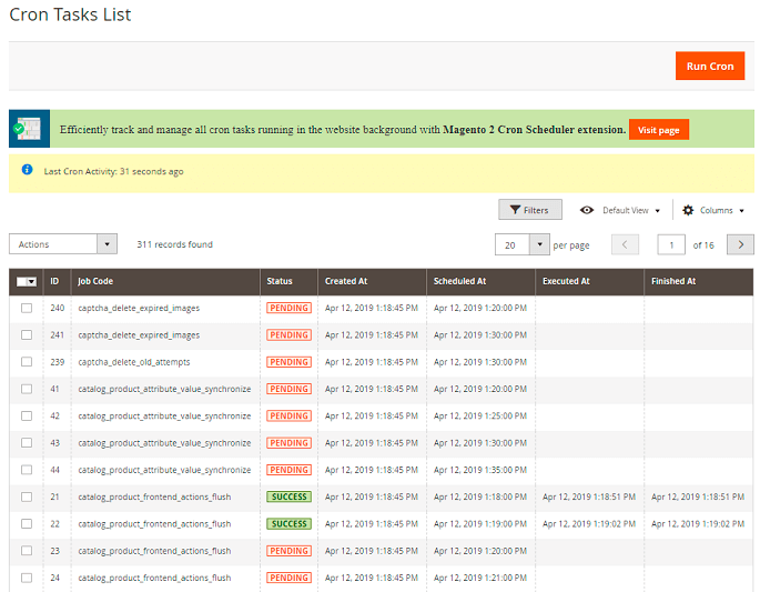 Here, you can see all the existing cron tasks and their statuses. Run cron tasks and generate their schedule by clicking the ‘Run Cron’ button. Also, delete tasks in bulk, apply filtering and sorting options when it is needed.