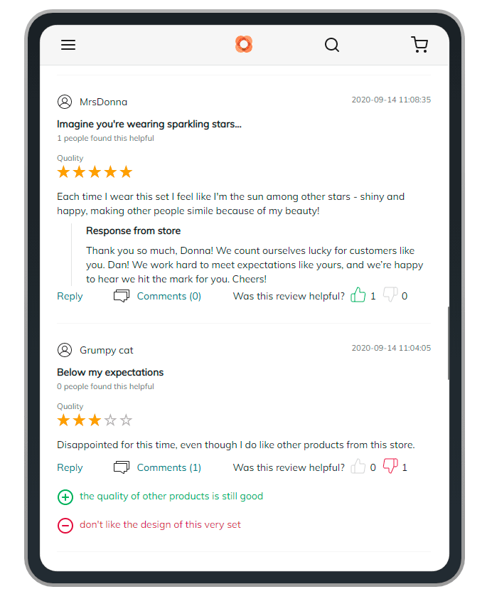 Here's the example of review threads with the pros and cons feature enabled and an example of the response from the store admin: