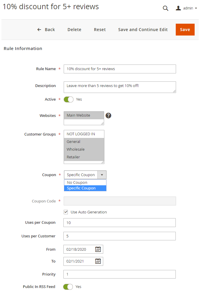 To build loyalty among the most active reviewers, you can give discounts according to the quantity of approved reviews. For example, let's see how to grant discounts for more than 5 reviews left.