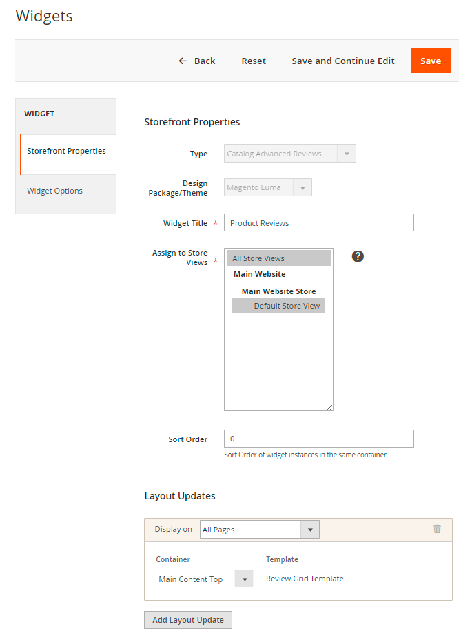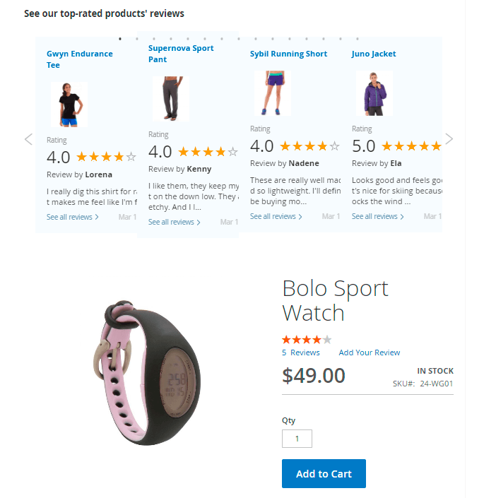 Attract customers' attention to specific products to promote them. Display a Reviews Summary widget on pages of your web-store to show reviews for the selected product(s). To configure the Review Summary, please go to the Content → Widgets → Add Widget button.