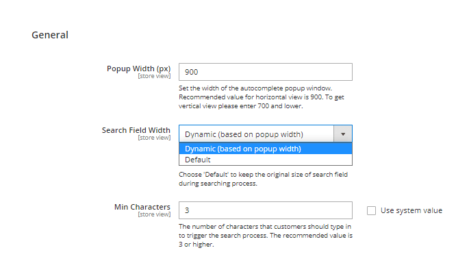 Popup Width (px) - indicates the width of the autocomplete popup window to make it fit in with other page elements. The recommended value for the horizontal view is 900. To get a vertical view, please enter 700 and lower.