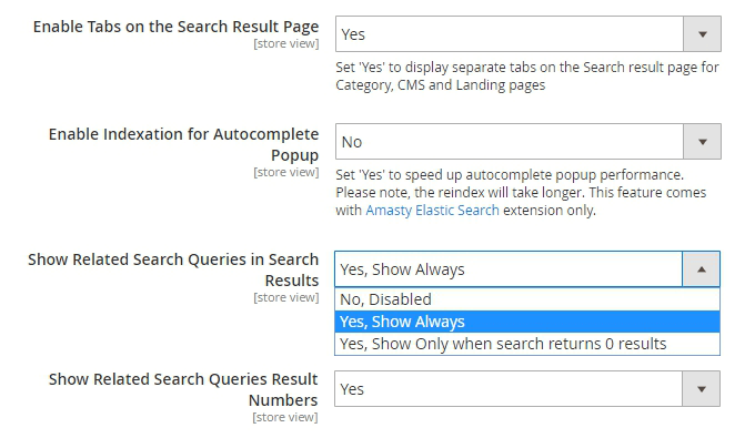 Show Related Queries in Search Results - adjust if the search should show to a customer the related search results. To learn how to assign related terms, please go to the Related Search Terms part of the guide.