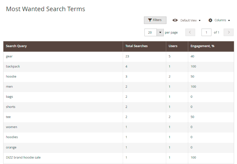 To see more details on Most Wanted Search Terms, go to Admin Panel → Reports → Most Wanted.