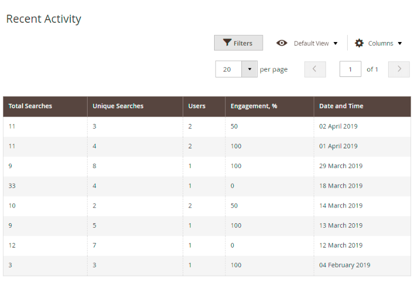 Here you can see the next values: total searches, unique searches, the number of users and users’ engagement. The Engagement statistics includes the page jumps to Brands, Categories, Blog, CMS & Landing pages.