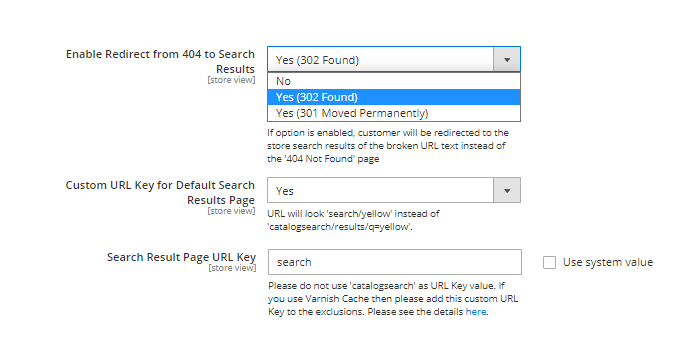 Enable Redirect from 404 to Search Results - if the option is enabled, when navigating to a broken URL or a non-existing page, a customer will be redirected to the store search results page instead of the '404 Not Found' page.