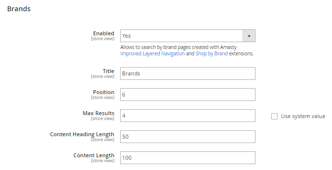 Specify the Title, Position, Max Results, Content Heading Length and Content Length for Brands block.