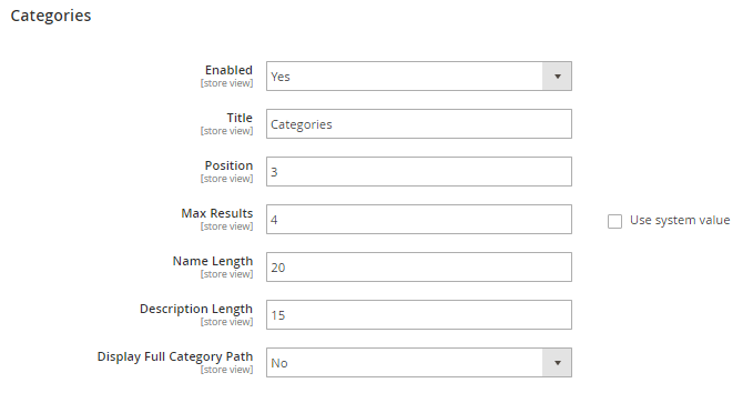 Specify Categories block Title, Position and the max number of displayed Results.