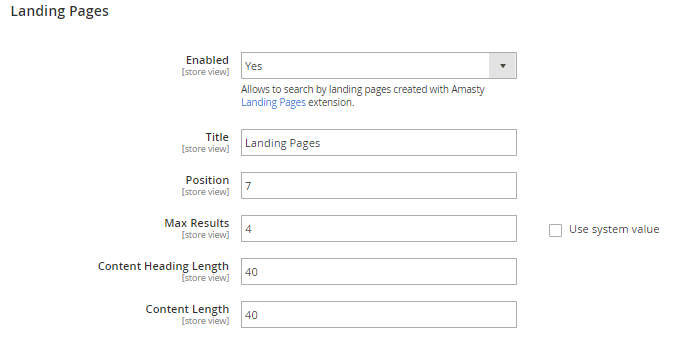 Enable search landing pages in the popup, specify the Title, Position and the Max Results. Set the maximal number of characters for Content Heading and Content that will be shown in the search popup.