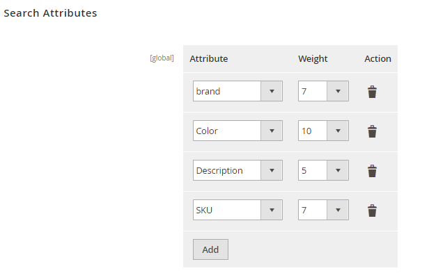 You can include any available product attributes in the search algorithm. For each attribute, you can set a priority (weight).