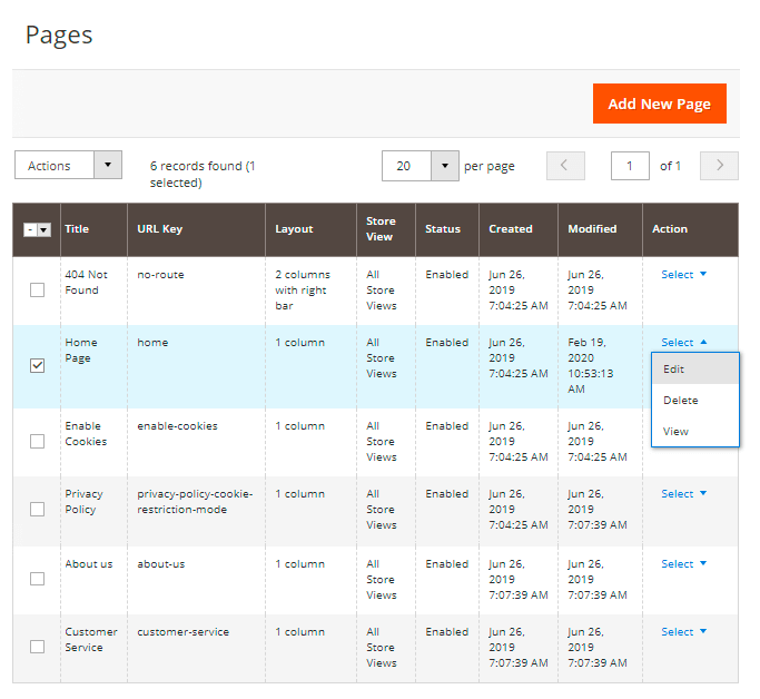 In order to customize your pages with handy widgets, e.g. make certain UX/UI improvements on the home page, please navigate to Content → Pages and choose from the grid which page you want to customize (or create a new page by clicking ‘Add New Page’ button).