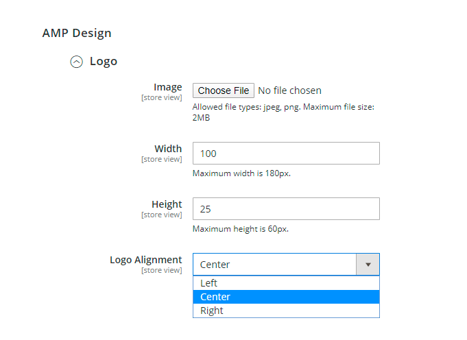 Logo Alignment - choose the logo alignment on your AMP pages. Position it by the center, left or right.