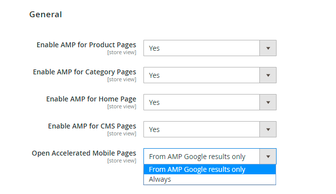 Open Accelerated Mobile Pages - if Always option is chosen, users on mobile devices will be invariably redirected to AMP version of the page. If you select From AMP Google results only, AMPs will be available only via links on Google search results pages (in that case the user will stay on AMPs until he/she reaches non-AMP page).
