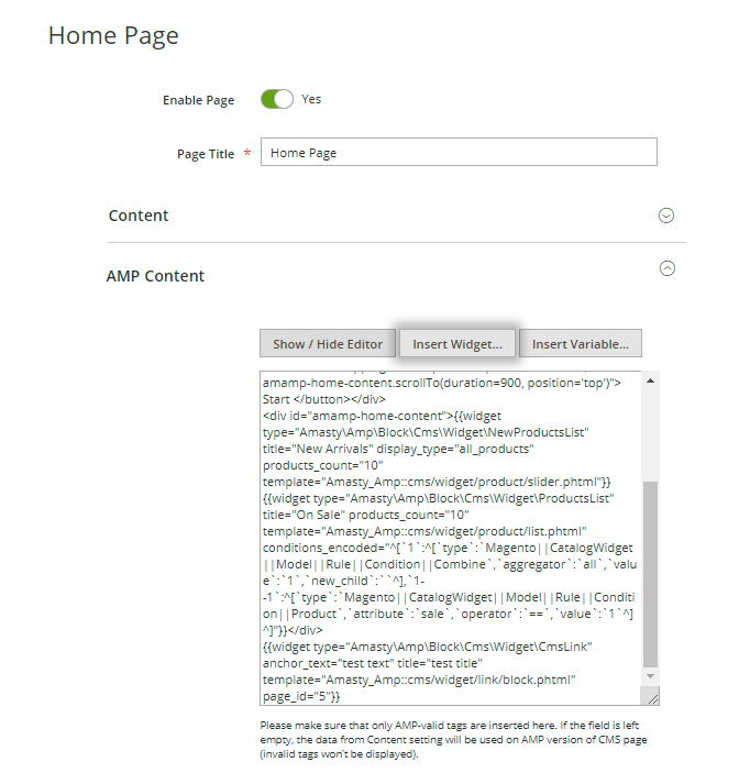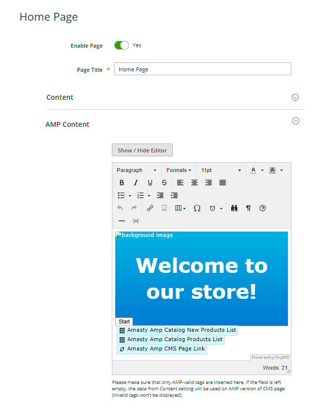 Enable AMP for CMS Pages - set to Yes to enable the module for CMS Pages.