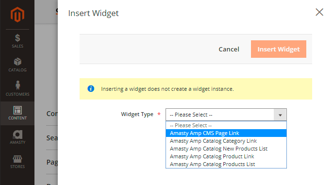 Click 'Insert widget' to continue AMP content configuration within the editor.