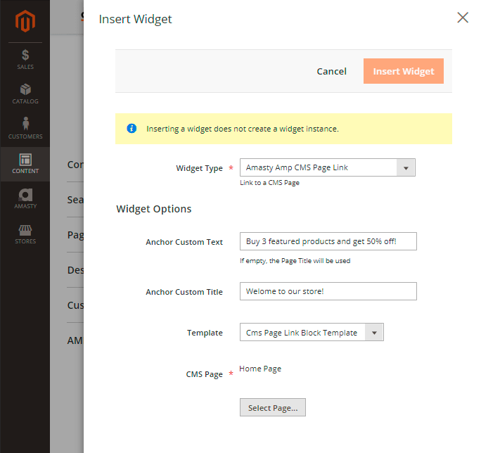 Specify Anchor Custom Text and/or Anchor Custom Title for the widget. Choose the widget template from the dropdown menu and specify to which CMS page this widget would be applied.