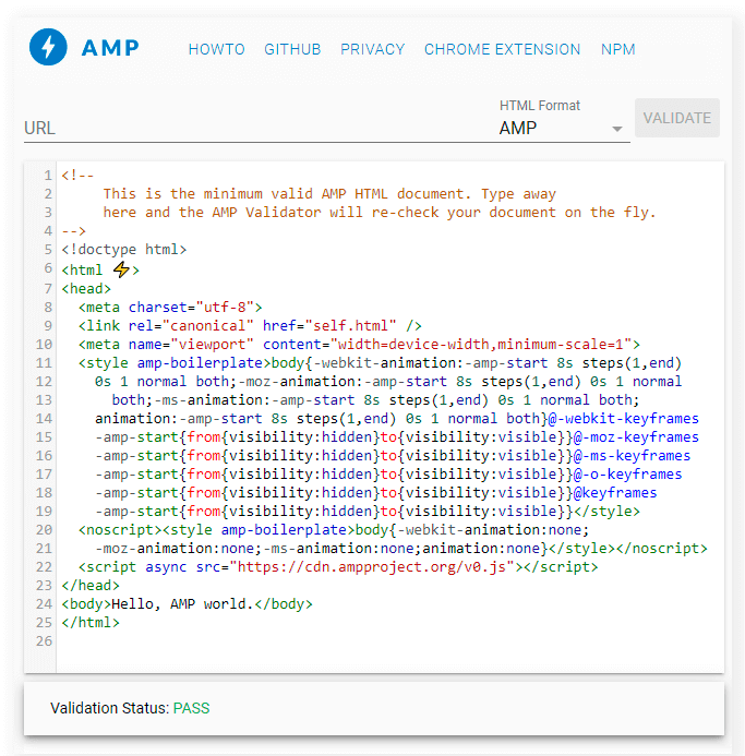 The web validation service provides you a live check if your pages are complying with the AMP or AMP4ADS standards. Run the test to get the list of mistakes inlines in your code with descriptions.