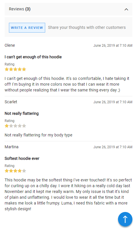 Display customer reviews on the AMP pages. By default, the first 4 reviews of the product are displayed. Customers can click the See More button to open the next 4 reviews. Also, the store visitors can hide all the open reviews with the button Hide.