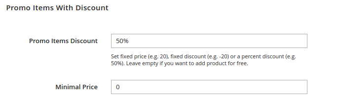 Promo Items Discount - here you can set a fixed price (e.g. 20), a fixed discount (e.g. -20) or a percent discount (e.g. 50%). If you want to add a product for free, leave this field empty.