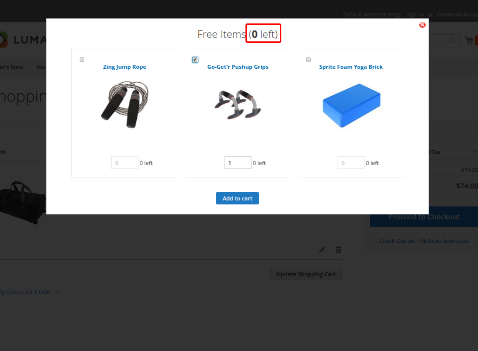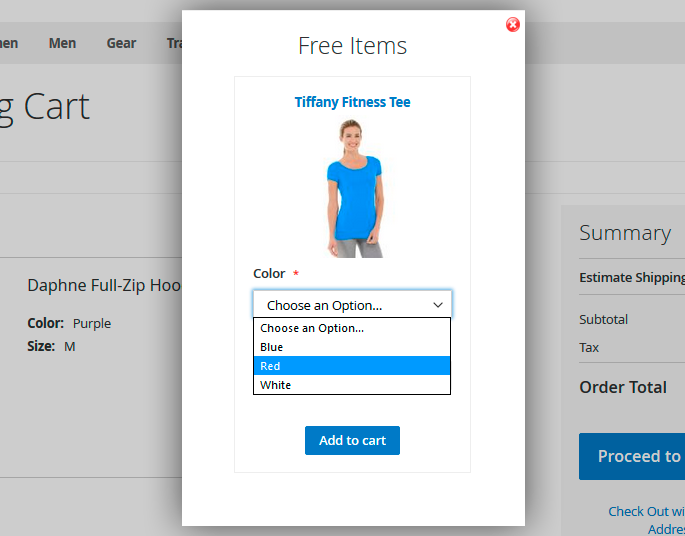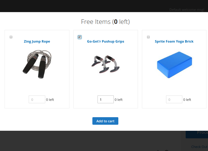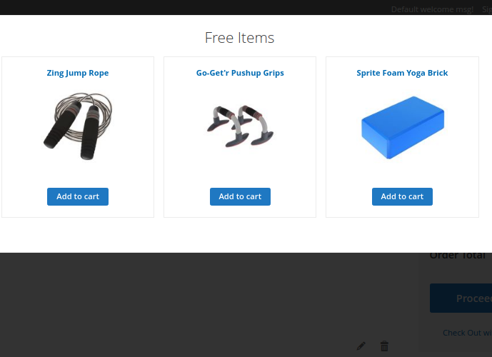 Here is the example of a special popup which appears on the shopping cart once a customer clicks on the Free Gift link.