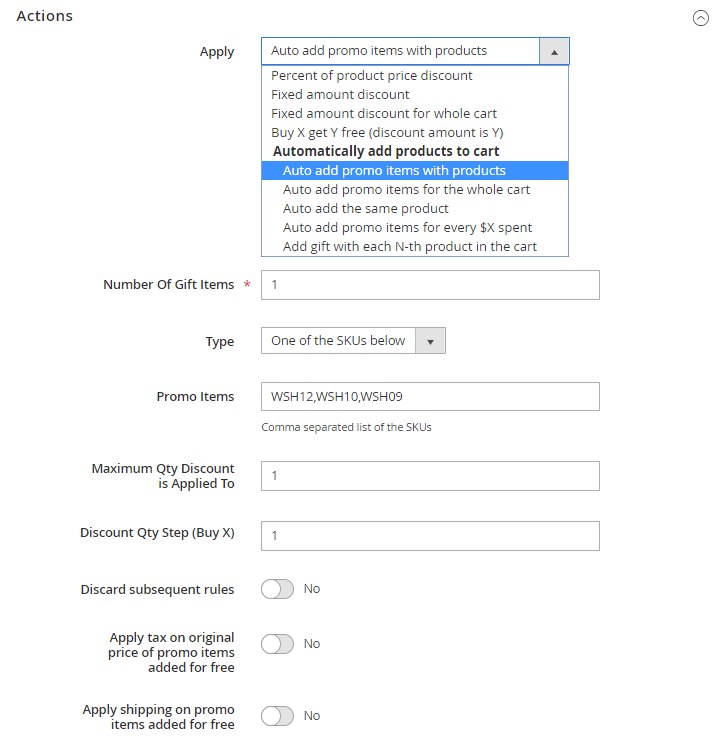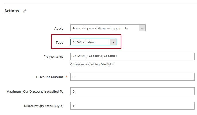 Type - Choose ‘All SKUs below’ option to automatically add to cart all promo items. ‘One of the SKUs below’ option will allow customers to choose one of the available promo items, specified in Promo Items field.